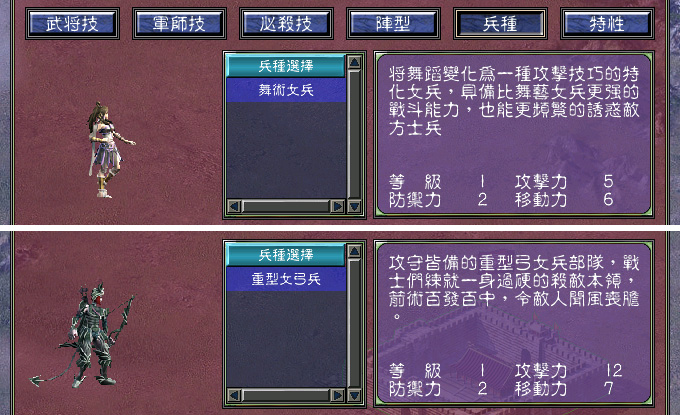 所以,在本作中人类国家的武将全部均为女性,全体战斗部队都是由女兵组成的(修改了部分兵种名称和移植了游戏原女兵部队的小兵图片)。她们所处的年代为第一次人类文明的最早期,属于远古代人种,身材高挑体格异常健壮,可以连续性的攻城拔寨。兽类国家则大部分是男性武将,战斗部队都是由兽兵组成的,这些兽兵也像女兵部队一样修改了兵种名称和移植了兽小兵图片(该偷懒时我决不含糊),这个游戏就好像专门为我设计的一样,什么龙虎豹熊五花八门的兽类兵种应有尽有。