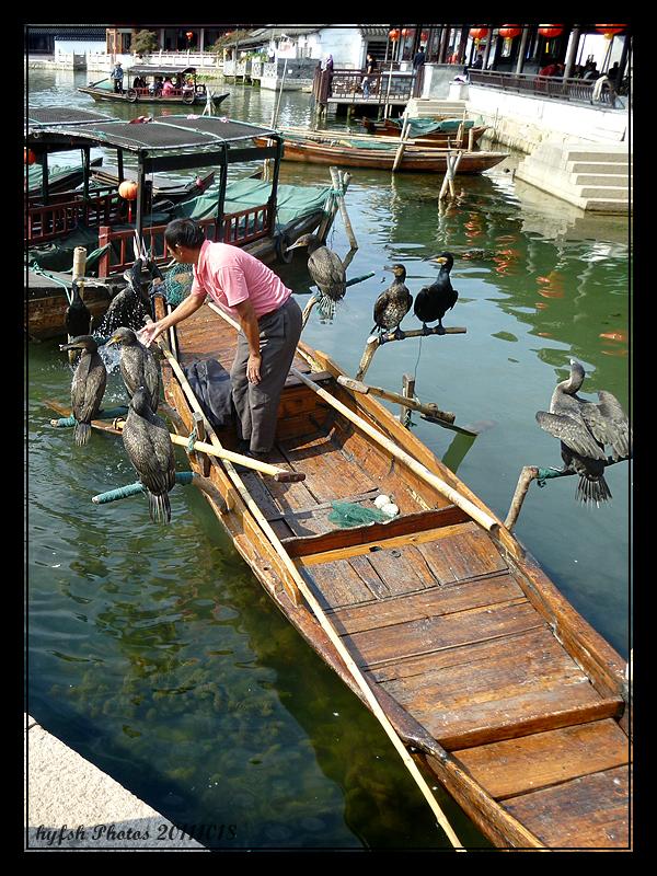 验票之后,首遇就是这个。渔人正舀着水给鱼鹰们冲澡,游人之中自然少不了少见多怪之徒,无数长枪短炮对这他们。看看这些鸟儿卖相还算光鲜,我也不免俗,留个纪念。