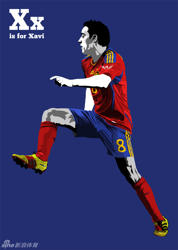英国插画师史蒂夫·威尔士(Steve Welsh)设计了一套精美插画,主题为“F就是足球”(F is for Football),共有26张,每一张各有一位球员,他们代表了A到Z。目前,他已在网上公布了18张,每一张都极为精美。