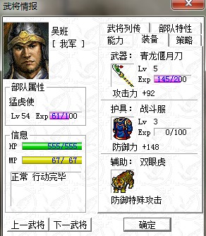 朋友们,刚刚玩到街亭之战。从一开始就没准备救马超,因为我觉得兀突骨、张苞一样可以培养以来,虽然张苞需要比较多的统帅果,可我还是觉得只要培养,张苞能力还是赶上马超的,而且多了一个不怕弓箭和投石车的骨头,S的防御,肉盾又多一个,可谓骨头一出,一阵叮叮当当,谁与争锋。另外,我还全力培养了吴班,S攻击,A+敏捷,回回双击,B+防御低点,不过也不错了,可以靠豪龙胆和格斗衣提高爆发,往树林里一趴,120%地形能力,生存能力大大提高,因为其士气超低,配上双眼虎,别看敌军回回暴击,打在吴班身上,铛铛作响,滴血不掉,那叫一个爽歪歪呀,如果配上青龙偃月刀,我气死你。看看我的人物培养吧,张苞是12级吃满果的,马超一死,立马上位,吴班也是12级吃满果的,好像是收姜维那关出场的,兀突骨38级吃满果。
