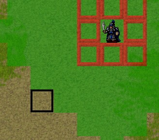 下图,当我军进攻到一定程度,打通吕布通往弓兵的道路时,吕布就会朝着弓兵移动,选择移动力消耗最少的一条路线,按照上右下左的顺序走到图中的白框位置。