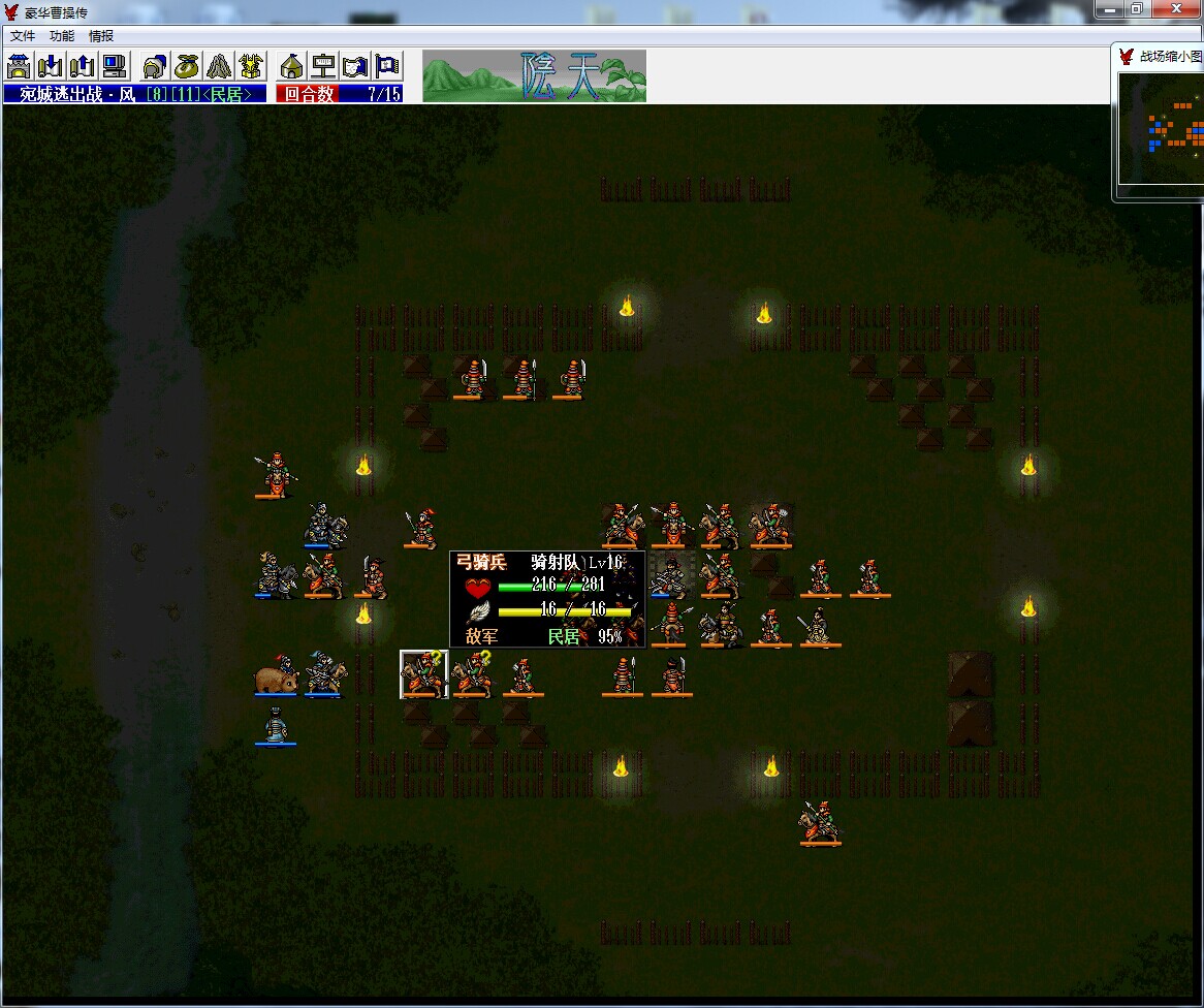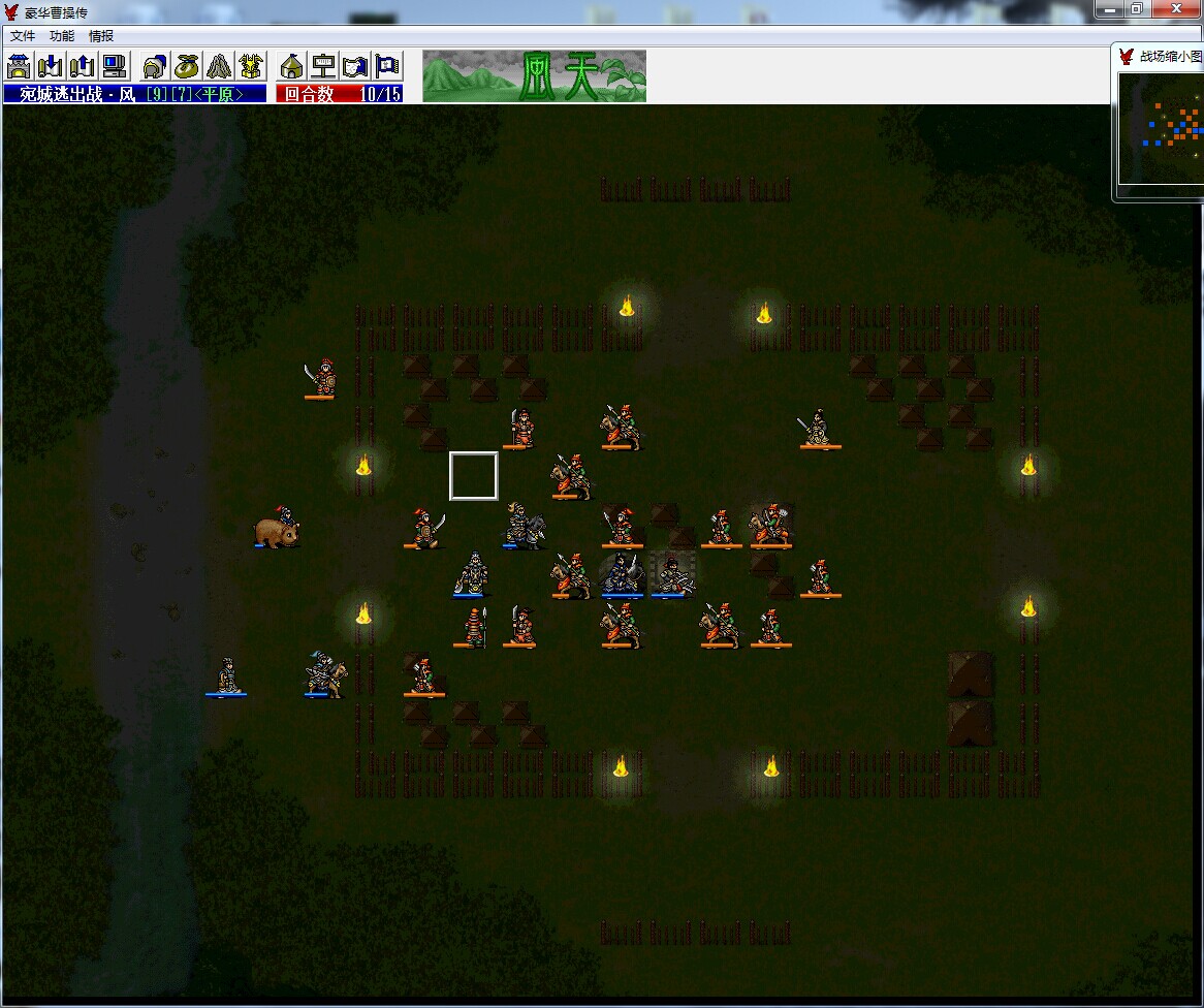 开始曹操和典韦站在宝物库和麓岩据守,曹洪逃命,重点是第5回合,在辞典大大的指导下,成功打伤了胡车儿,又让旁边的骑兵残血,电脑优先给骑兵加血,第6回合成功杀掉胡车儿。