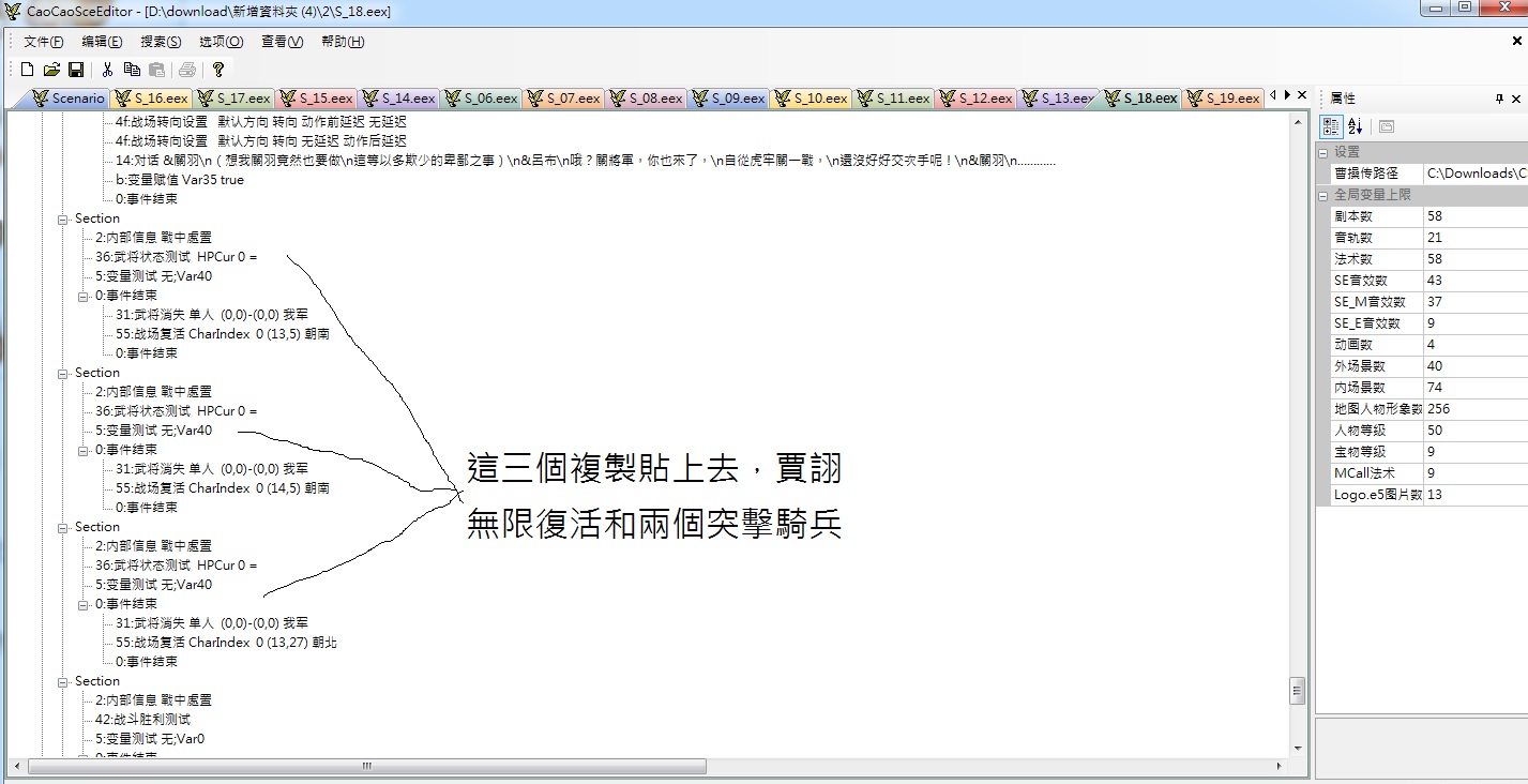 須使用新版本的劇本編輯器,把圖中的這三個複製,再貼上原本的定點清除呂布傳6.1的s18劇本裡