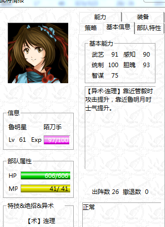 大家关心的雄狮伍登,平级的,有几个托等级比较严重,所以,伍登收进来59级,数据一般,比较平衡的兵种,第一关还是山水战,雄狮的地形适应比较差,移动也差,没有发挥空间,带着虎类豹,效果还行,给周围尉迟、姜松加士气,加大特技的几率