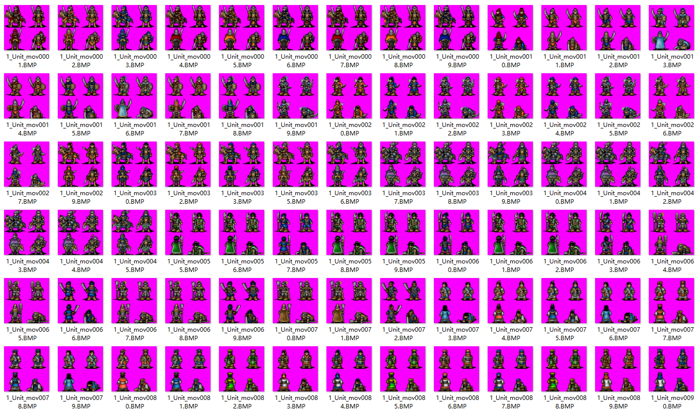 凡事都要从最简单的阶段做起,首先尝试的是单帧形象生成,我一共取了12个mod的全部mov形象,去除了女性、工兵(如炮车辎重)、动物和全部旧比例形象,一共收集了5500张单帧形象。