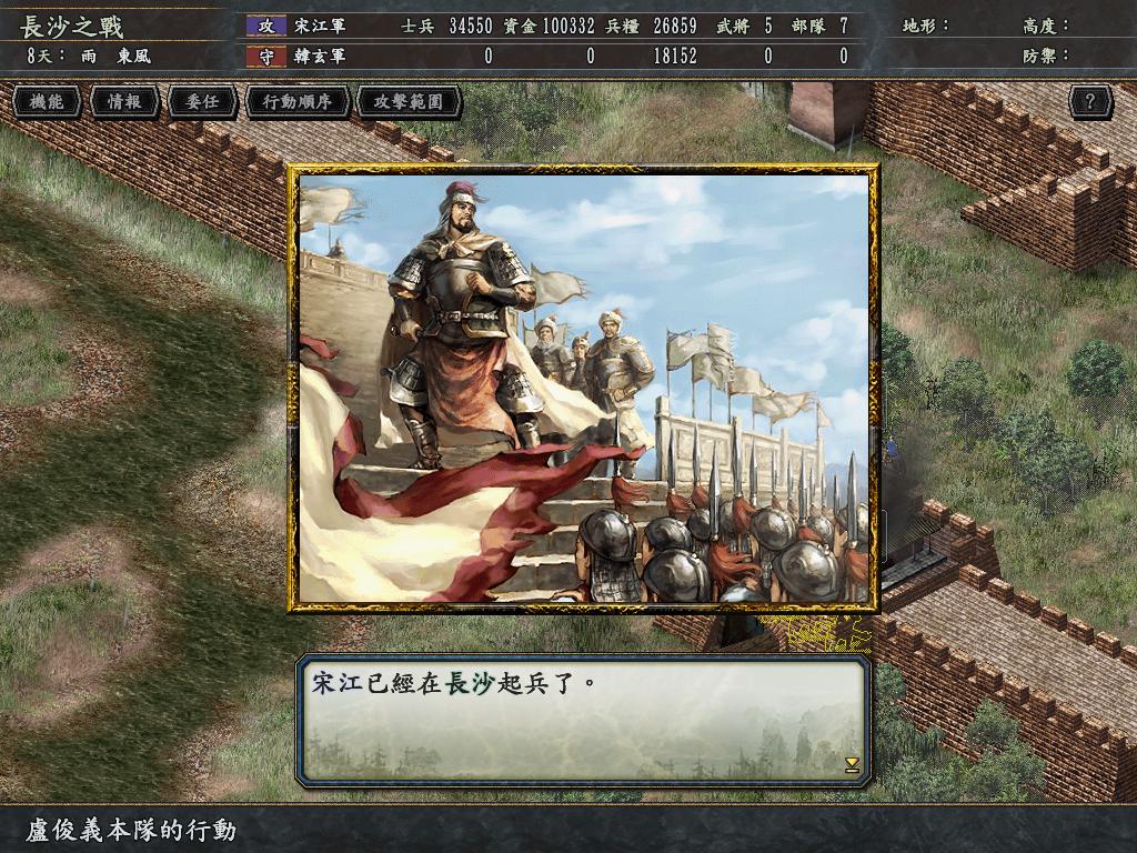 背景选为207年的剧本,操纵人物为宋江,宋江等108将皆于长沙在野,彼此之间亲密度都是100(但宋江又都不相识,除了对扈三娘和宋清),宋江有私兵10000,同时也有几个头领也是有私兵的,就看玩家怎么举旗兴兵,与天下争衡了!108将流失的速度也很快,先占长沙还是先聚齐108将,由您自己决断!