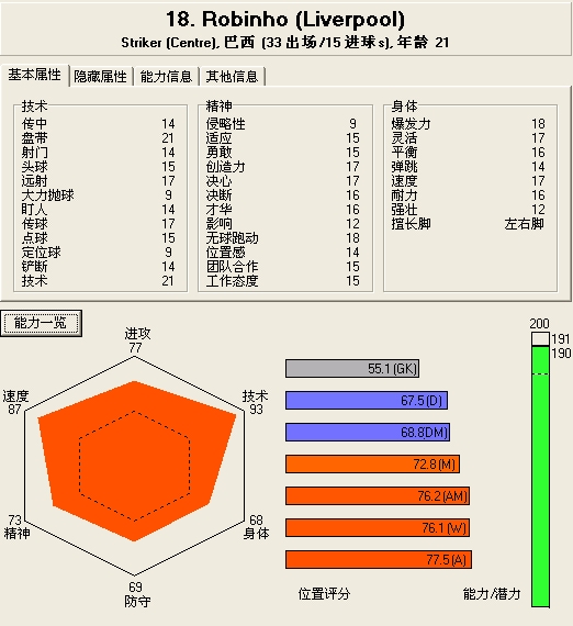 开了个潜力196的阿隆索是我能坚持下来的关键,的确是非常好用的人,几乎没有欠点~~一般情况下中场队员如果有2项低于75我就不用了,阿龙索除了速度全过75了,实在是牛人挖 他速度74