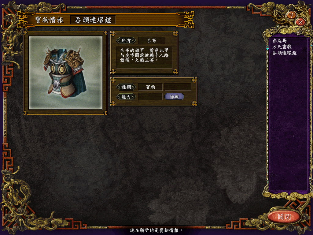 使用:下在全部文件解压缩,D_Titem.s9是宝物文件,放在My Documents\Koei\San9 TC\TItem下,D_TPrsn.S9是新武将文件,放在My Documents\Koei\San9 TC\TPrsn下,D_Sav035.S9是原始存档文件,放在My Documents\Koei\San9 TC\Savedata下,默认是第34个存档位置。其他的文件就放在游戏安装目录下。由于我不知道宝物图片是那个文件,所以可能一些新宝物的图片会有偏差,希望知道的朋友可以告诉我,我好把它传上来。