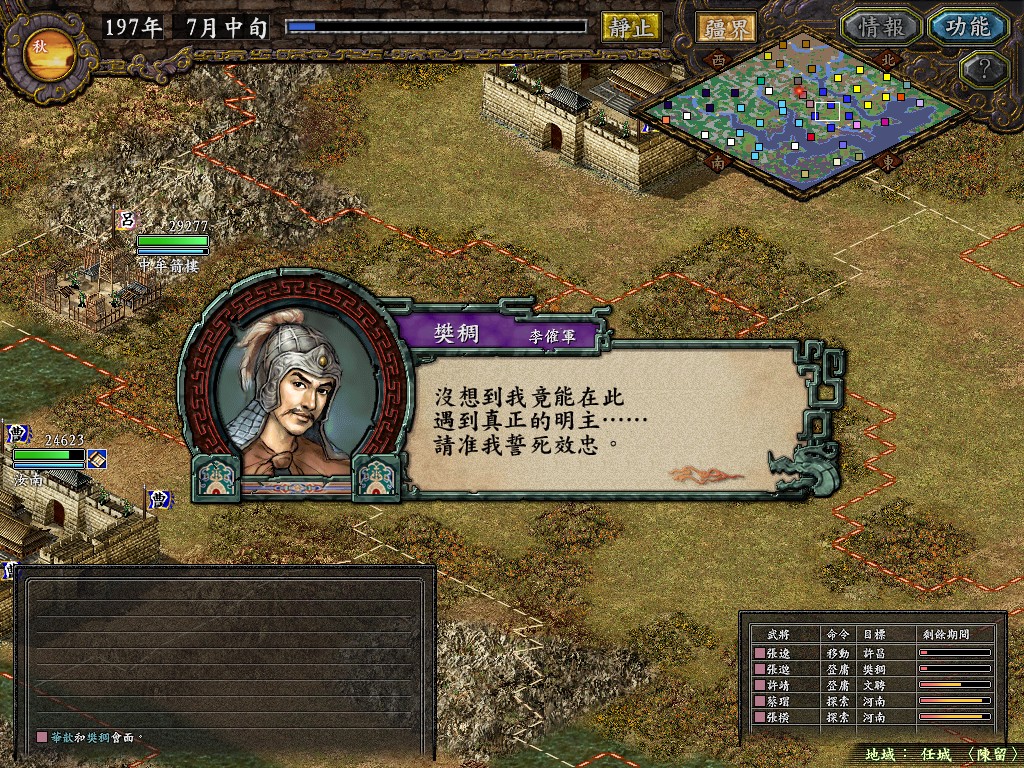 陈宫:恭喜温候入主陈留。曹操虽被压制在濮阳,但目前将领数是我军的三倍,士兵数是我军的两倍,钱粮无缺,想必他很快就要大举反扑陈留了,还请主公早做准备。