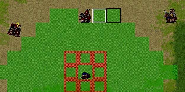 下图,当我军进攻到一定程度,打通吕布通往弓兵的道路时,吕布就会朝着弓兵移动,选择移动力消耗最少的一条路线,按照上右下左的顺序走到图中的白框位置。