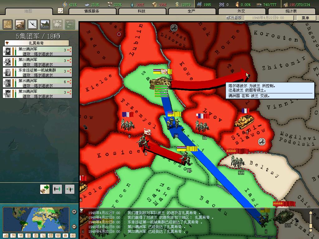 标题: DA1.3原版36满州国娱乐战报, 已更新至:1948年夏季 中日满轴心对抗英法美同盟 欧洲反攻势如破竹 攻陷华沙 吞并波兰!
