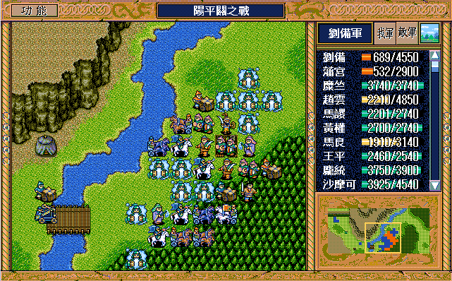 本战曹军声势浩大、精锐尽出,但我方亦非浪得虚名。征战大半天下的刘老板调配有度、从容应对,经过45回合的鏖战,终把阿瞒打得漫天飞“翔”。由于有杨修、司马懿及运输队,所以敌军兵力完全不用担心。名将打人还确实疼,于是仅有的三个普通骑兵和一个武术家就入了刘辟彀中,他的翻身仗就在此一举——前期反击二人并反击死一个普通骑兵,后期策略补够后就可以在刘备、赵云及刘封的帮助下反击武术家和另两个普通骑兵,最后还带着这三个拖油瓶组成了阳平关休闲旅游六人团。刘辟的春天终于到来,此战又多抢了大半级,今后只要再抢个四、五下反击就达到终极目标了,只是稍微影响了点藩宫和陈式的经验,但是有张郃、曹洪两员升级大将(后叙),损失几乎可以忽略。话又说回来,许昌I的反击资源都是藩宫(和魏延)的,许昌II的反击资源基本都是陈式的,到时刘辟不抢功,还是他俩来享用。本战有三人可以升级,张郃、曹洪不难,一接触就能升级,但许褚的升级是个大问题。之前他在徐州II和汝南各用了2次策略积32点经验值,要升级需用9次策略,他只有40点策略值,那么他仅能用1次挑拨,其余8次只能牵制或激励。靠着中前期降张郃及夏侯惇的士气可以提供中后期激励3次张郃及1次夏侯惇的机会。张郃倒没什么,而且兵力补充也充分,但是过早降夏侯惇的士气,兵力下降较多,就会影响司马懿过来的那回合(第25回合)的站位,他就不会进树林到他该到的地方。即便算他4次激励,加上最后剩4点只能用牵制,那么还得用3次牵制,这才是极极难的地方。就算S/L到吐一地,也未必能见到他用牵制,我也只是在多遍重打的过程中见过1次,更别提3到4次了。更为关键的是,即使经过天文数字般的S/L到他升55级也要34回合了,此时陈式56级、藩宫54级,已经不影响大局了,顶多略有遗憾,毕竟过了阳平关就不需要敌军升级了。所以许褚升级就是个鸡肋,还是放弃了。糜竺到43回合可以升90级,可为我方多提供策略恢复,前期调配好藩宫和陈式的行动方式,最后一回合正好潘宫、陈式、庞统都可以用大火龙,加上吴兰还可以攻击一次,就可以把梅花五的敌军全部消灭,虽说没什么大影响,但看看还是挺爽的。