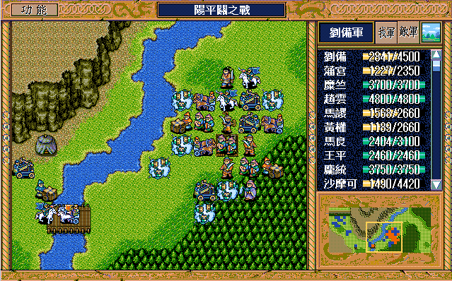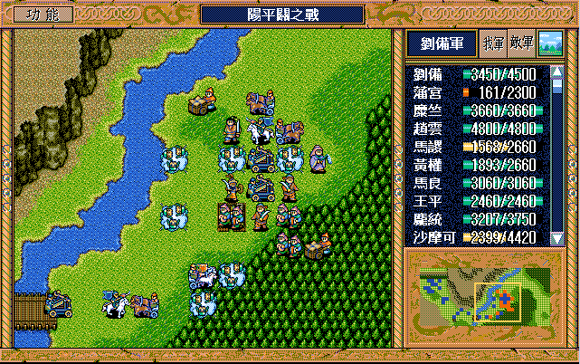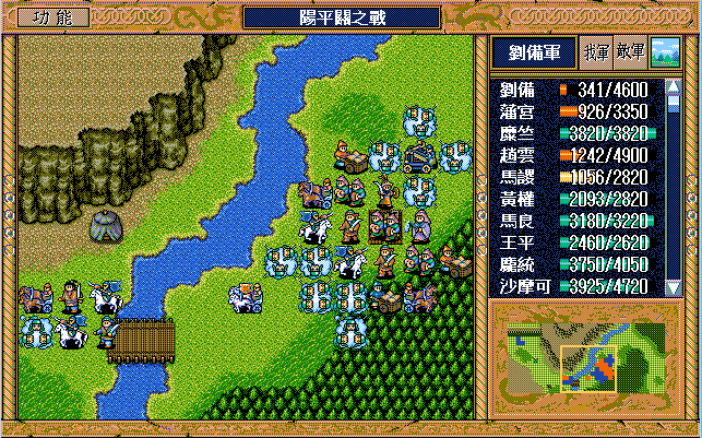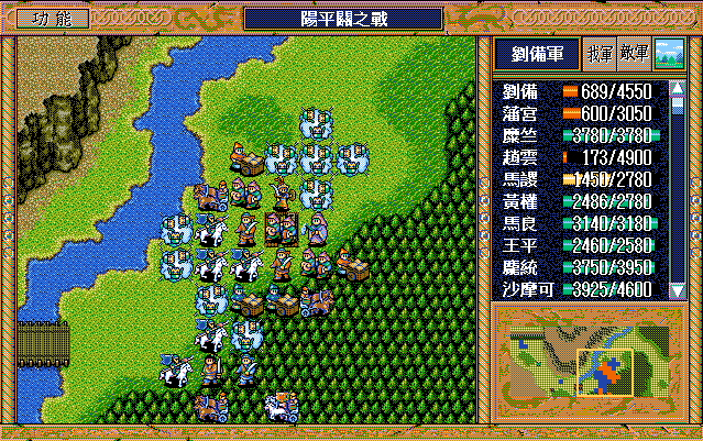 本战曹军声势浩大、精锐尽出,但我方亦非浪得虚名。征战大半天下的刘老板调配有度、从容应对,经过45回合的鏖战,终把阿瞒打得漫天飞“翔”。由于有杨修、司马懿及运输队,所以敌军兵力完全不用担心。名将打人还确实疼,于是仅有的三个普通骑兵和一个武术家就入了刘辟彀中,他的翻身仗就在此一举——前期反击二人并反击死一个普通骑兵,后期策略补够后就可以在刘备、赵云及刘封的帮助下反击武术家和另两个普通骑兵,最后还带着这三个拖油瓶组成了阳平关休闲旅游六人团。刘辟的春天终于到来,此战又多抢了大半级,今后只要再抢个四、五下反击就达到终极目标了,只是稍微影响了点藩宫和陈式的经验,但是有张郃、曹洪两员升级大将(后叙),损失几乎可以忽略。话又说回来,许昌I的反击资源都是藩宫(和魏延)的,许昌II的反击资源基本都是陈式的,到时刘辟不抢功,还是他俩来享用。本战有三人可以升级,张郃、曹洪不难,一接触就能升级,但许褚的升级是个大问题。之前他在徐州II和汝南各用了2次策略积32点经验值,要升级需用9次策略,他只有40点策略值,那么他仅能用1次挑拨,其余8次只能牵制或激励。靠着中前期降张郃及夏侯惇的士气可以提供中后期激励3次张郃及1次夏侯惇的机会。张郃倒没什么,而且兵力补充也充分,但是过早降夏侯惇的士气,兵力下降较多,就会影响司马懿过来的那回合(第25回合)的站位,他就不会进树林到他该到的地方。即便算他4次激励,加上最后剩4点只能用牵制,那么还得用3次牵制,这才是极极难的地方。就算S/L到吐一地,也未必能见到他用牵制,我也只是在多遍重打的过程中见过1次,更别提3到4次了。更为关键的是,即使经过天文数字般的S/L到他升55级也要34回合了,此时陈式56级、藩宫54级,已经不影响大局了,顶多略有遗憾,毕竟过了阳平关就不需要敌军升级了。所以许褚升级就是个鸡肋,还是放弃了。糜竺到43回合可以升90级,可为我方多提供策略恢复,前期调配好藩宫和陈式的行动方式,最后一回合正好潘宫、陈式、庞统都可以用大火龙,加上吴兰还可以攻击一次,就可以把梅花五的敌军全部消灭,虽说没什么大影响,但看看还是挺爽的。