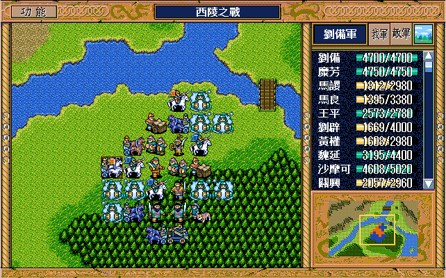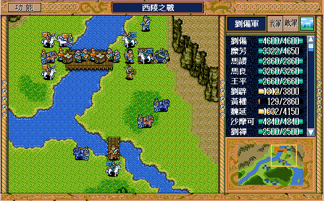 我 吴兰右一援助、黄权上激励吴兰,刘备下假情报骑兵2,马良左下补给刘辟,刘辟牵制弓兵6,糜竺进村庄激励陈式(从此不变位置),陈式上攻击步兵5,马谡上激励藩宫,庞统下一,藩宫右一上二大焦热(失败),刘封右援助藩宫,王平右援助陈式;