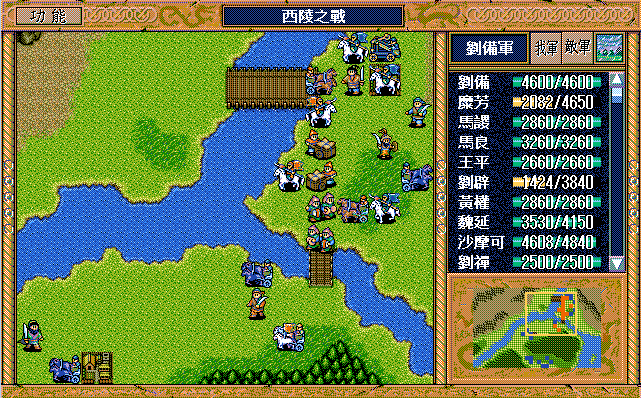 我 刘备左五上一激励自己,刘封左下假情报弓兵4,马良大救济,吴兰开始原地援助刘辟,黄权激励自己,糜竺开始激励陈式,陈式开始大焦热(伤害夏侯惇三回合,开始伤害张郃,本回合伤害骑兵2),马谡开始激励、王平开始(后不说明都是)补给藩宫;