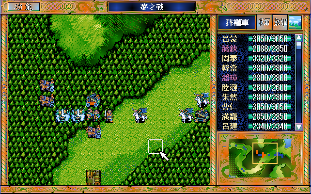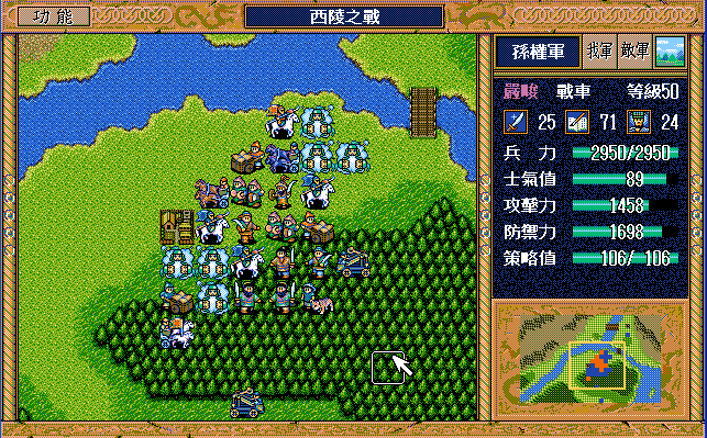 第24回合后:孙桓援助的差不多了刘备把骑兵混乱,放孙桓下来攻击马良,刘备绕过去准备卡位,沙摩柯在合适的时候灭掉上方步兵,让孙桓到这个位置,这样才能大策略吃主将。运输队醒来后大救济,然后到村庄左侧补给骑兵,糜芳混乱之,不能让他进村,否则后面没法利用村庄给骑兵补血了。魏延左侧骑兵血量不足时进村挑拨糜芳,左下骑兵醒来上移攻击魏延,运输队左下攻击魏延重新成阵,然后糜芳混乱村中骑兵,刘备攻击严畯并卡位,严畯醒来开始援助魏延下方骑兵。后面主要就是sl敌军的援助对象,敌军两个贼兵的策略真讨厌,中间用过若干次策略,否则还能多反击几下,体力是足够的,最后只能反击死猛兽和武术家,两个贼兵体力基本满的。
