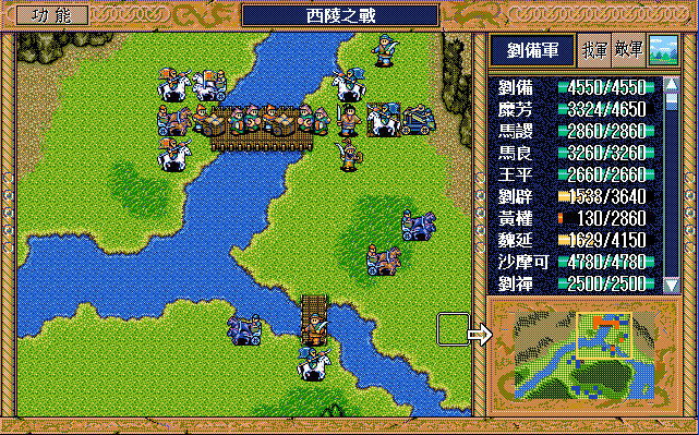 第5-10回合:魏延后退攻击步兵,把骑兵引到桥上方,然后刘辟断后,刘备魏延当前锋过桥,中间控制敌军步兵的援助对象。