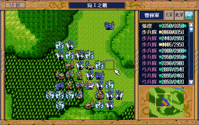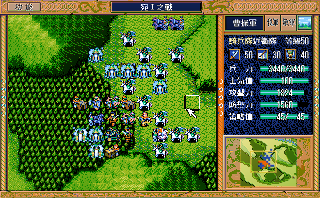 后面孔明伪装混乱梅花五,开始放火,刘备帮忙成阵后吸引两个步兵下来,其中一个混乱备用,然后出发拿青囊书给吴兰,吴兰第18回合变运输队,由于敌军ai太讨厌,没有刘备配合敌军会乱走,敌军体力根本反击不完.注意保留激励点,第34回合刘备出发,第37回合灭曹仁左下一个步兵,吴兰灭步兵给关羽开路,关羽出发去单挑曹仁
