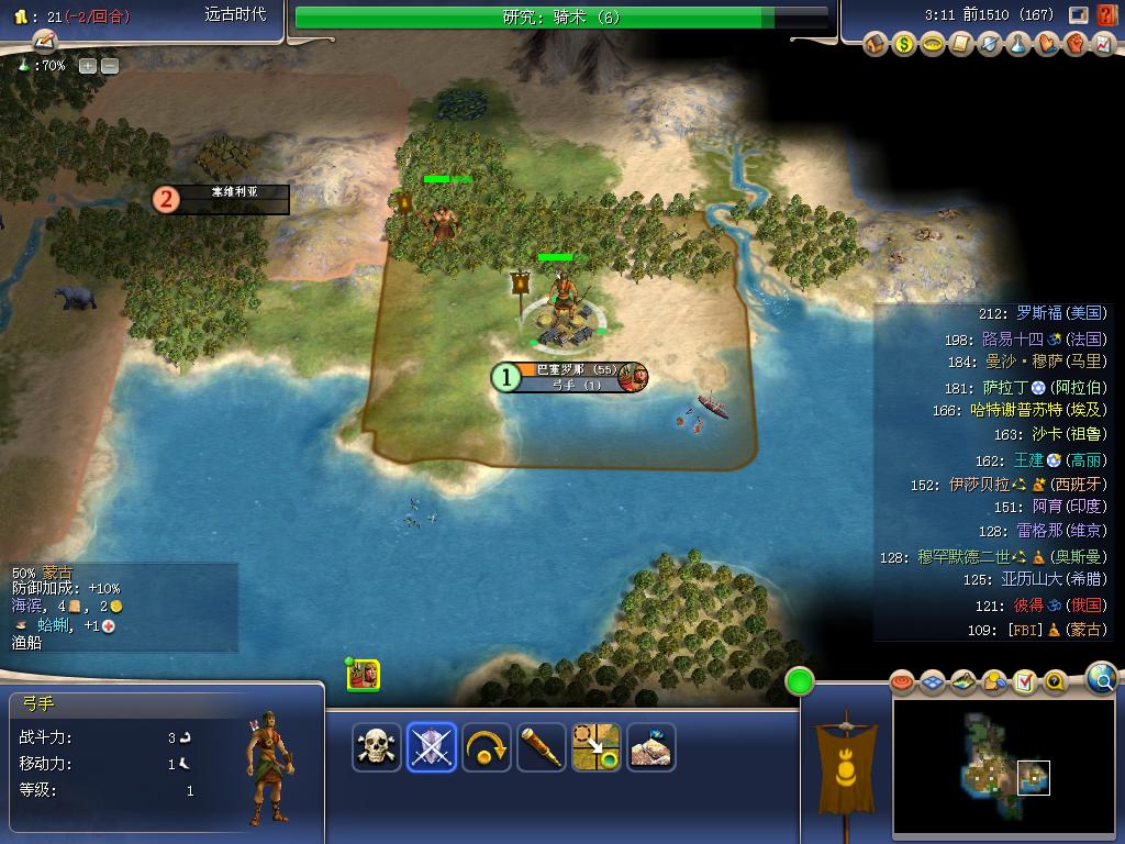 顺便说一下,埃及MM(黄色)已经在我北边沙漠地区放了3座城市(地图上能看出来),正好在我和老萨(最北的淡绿色)之间,在后来起到很关键的作用