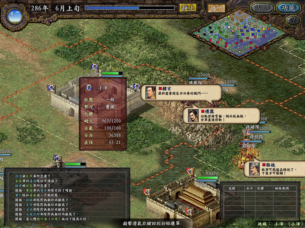 PS:革新里面的以上几条都是按我设想的来做的,但是感觉革新的兵力部署不像39这么聪明,比如39的电脑把兵力都部署在跟敌对势力接壤的据点,每个据点都重兵防守,而革新往往顾此失彼,比如东西跟两个势力接壤,它可能在东面重点布防,却丢了西面,如果玩家在西面,可以轻松从西面抄它后路,这点也不好,另外革新的计略太变态,把不错的战斗系统平衡一下子破坏了,一颗老鼠屎坏了一锅汤.