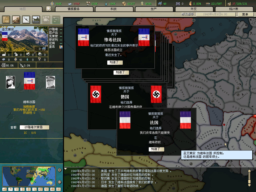 原定38年4月對波蘭宣戰,但經推演發現早戰對局勢發展不利,所以改變計劃,定于39年德國對波宣戰後再趁火打劫。一年多和平時光專心跟德國換圖紙、換資源,發展科技,擴充軍備。百無聊賴中看了看中國戰場,發現僞滿幾乎被遊擊隊切成兩半。
