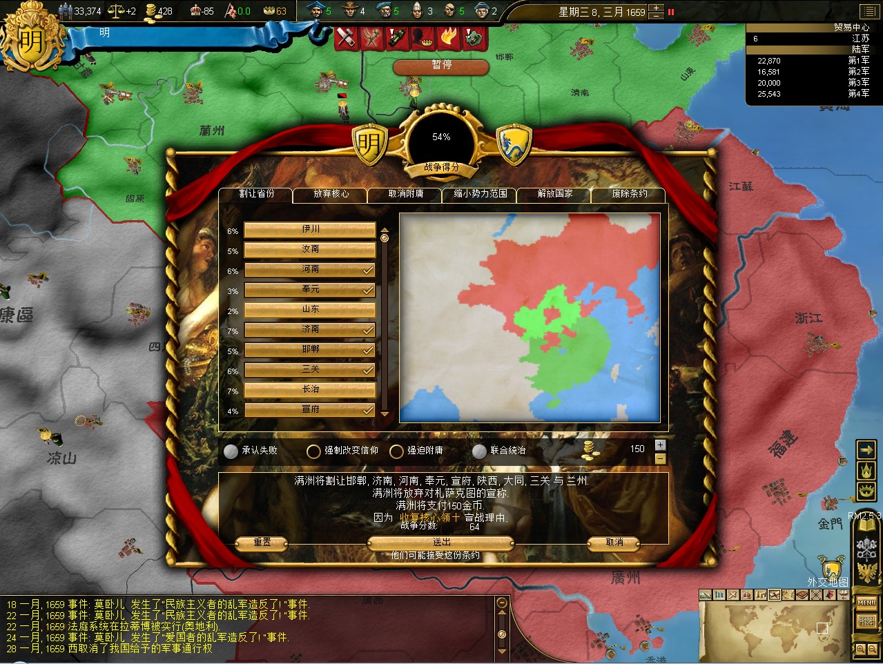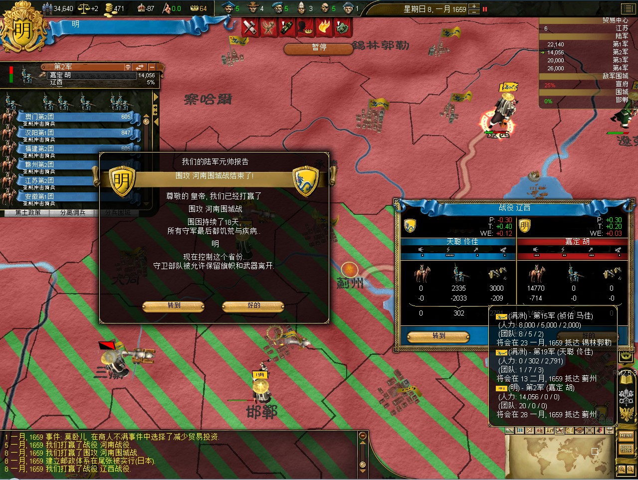 汇报进度。明代中国全境收复,建奴全灭,逆推尼德兰。现有领土:明代中国,满洲,朝鲜(对马(日占),郁陵(朝占)除外),越北,尼德兰旧领2处(包括一个贸易中心),夏威夷,非洲与南太平洋殖民地数块。时间1720年。明日补战报。