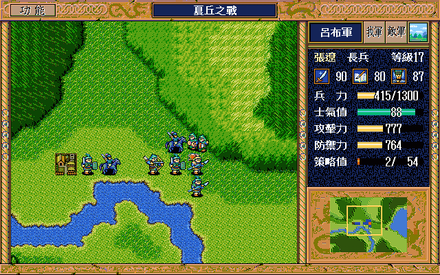 第十八回合起向袁术中军移动,只要陈纪不挡路,可以左1上3、左2上2、左4三步来到草地中央。然后利用营寨和河流的狭窄通道灭纪灵,第二十五回合起向左上鹿砦移动。