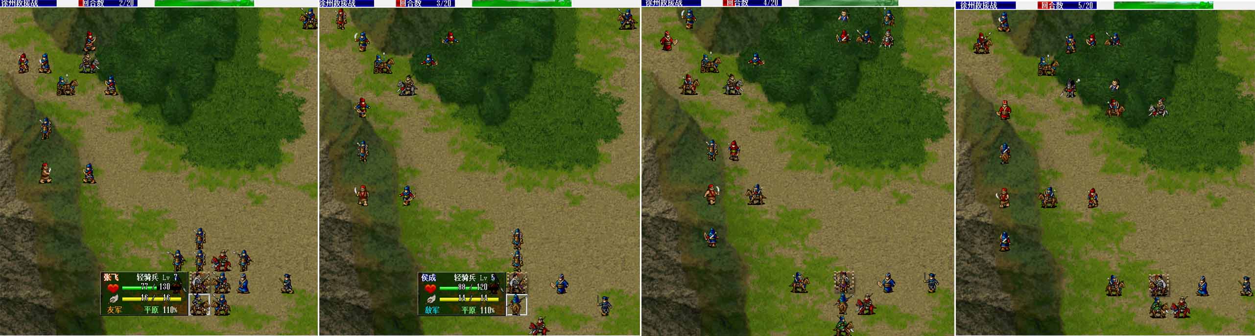 第三回合曹仁快速向左撤退,跟着程二德子、废物曹洪去抢西门鹿寨,白地将军拉两个骑兵过荒地。
