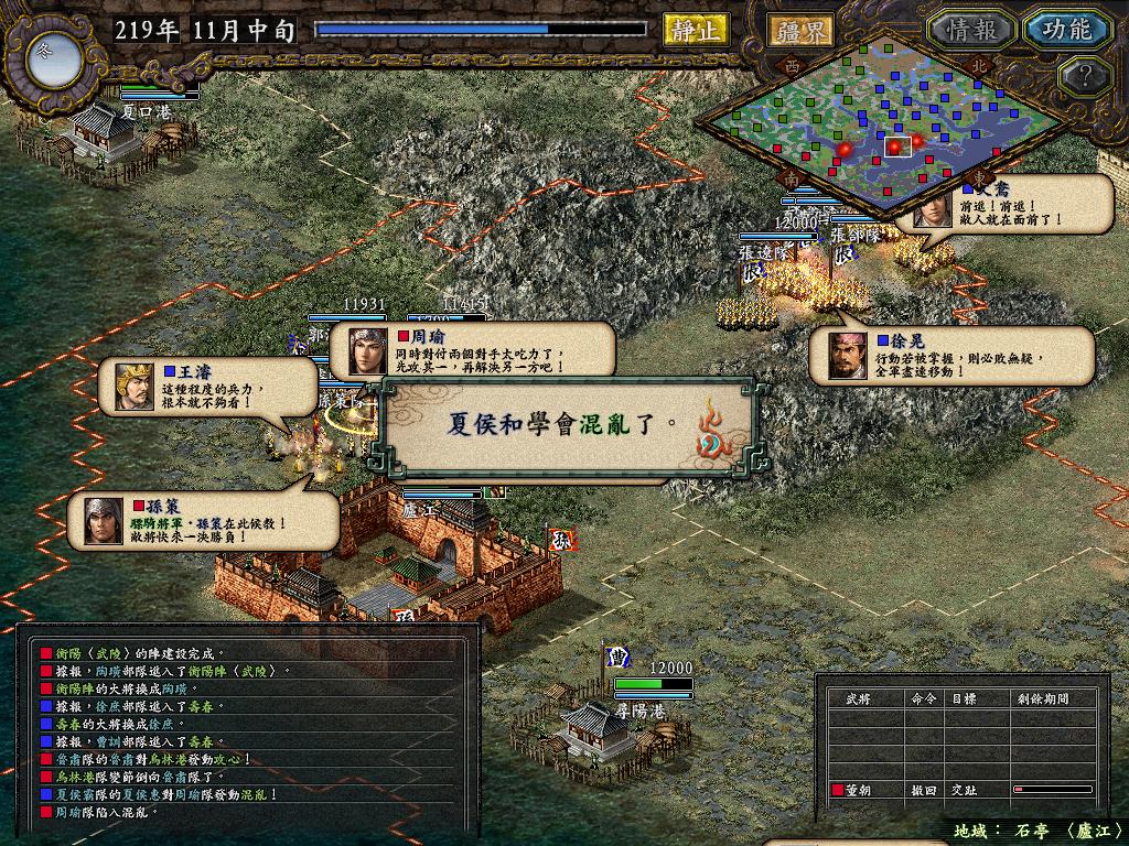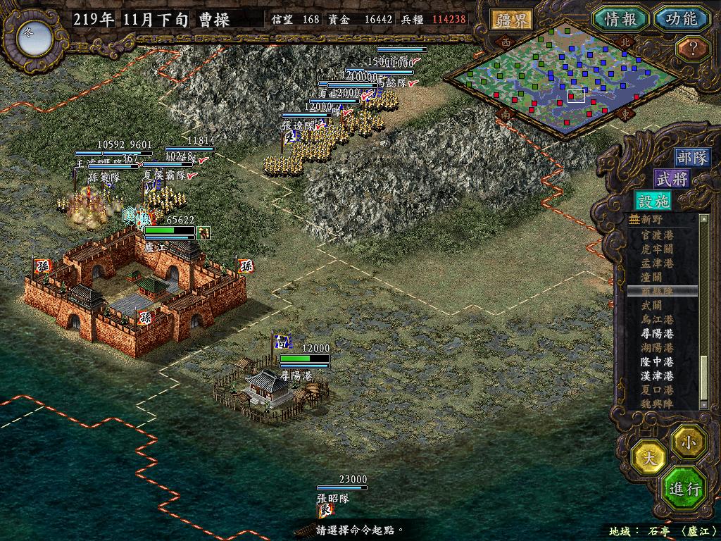 进行面:第二天曹彰就夺取寻阳,吴国各部除孙策由西门杀出,6W2皆呆于城内.夏侯霸部一马当先,发动连锁奔射,公谨损失1300人,剩余300兵马仓皇南逃,郭淮轻骑终于赶上,王双于阵中冲出,当下擒住公谨,三尖刀一闪,公谨重伤落马,徐盛见状,回马来救,拖回主帅,吴兵围上,策见状,大呼:公谨无恙呼!一个奋迅,杀的左翼的王睿人仰马翻.公谨只剩半口气,呻吟曰:既生瑜,何生双!夏侯部的夏侯惠见兄立大功,不甘示弱,文有文用,一个混乱定主公谨,吼道:复呻吟乎?自此瑜部全灭,徐盛为救公谨被俘.策的5000步兵也杀的只剩300人.