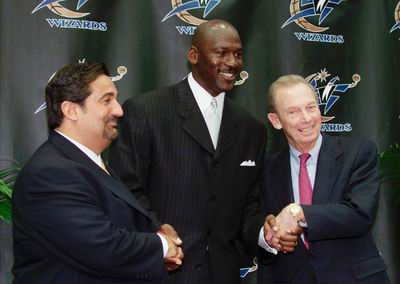 1999年1月13日,因为总所周知的原因和公牛老板闹矛盾,乔丹召开新闻发布会,第二次宣布退役,并表示“99.9%”不会再复出。图为NBA总裁斯特恩(左)与公牛队老板(右)在发布会上向乔丹颁发1998年的总冠军戒指。