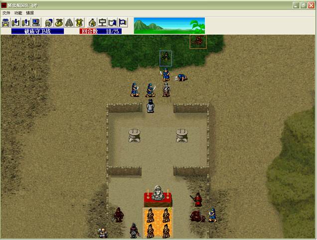 下回合,汤怀触发乌国龙出击.王佐毒死骑兵,张显打道士,施全给王贵补血.(PS:王贵不要打死步兵,打至濒死即可!这样杨BT会走到吹死他!而不是去攻击文官)下回合変成这样.(12)