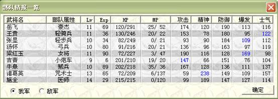 下回合待女经过道士放毒和禁军,剩下50~60左右的血,可以由黑风高击退;两友军骑兵都被敌军击退.王佐最大范围降士气,王贵顶在折旁边暴击骑兵,由友军击退,施全给王贵加防,牛吸引连弩的攻击,注意不可以让梁红玉把连弩打残,因为残兵先行动的原理会令局面失控.s/l折彦质反击骑兵暴击. (8)