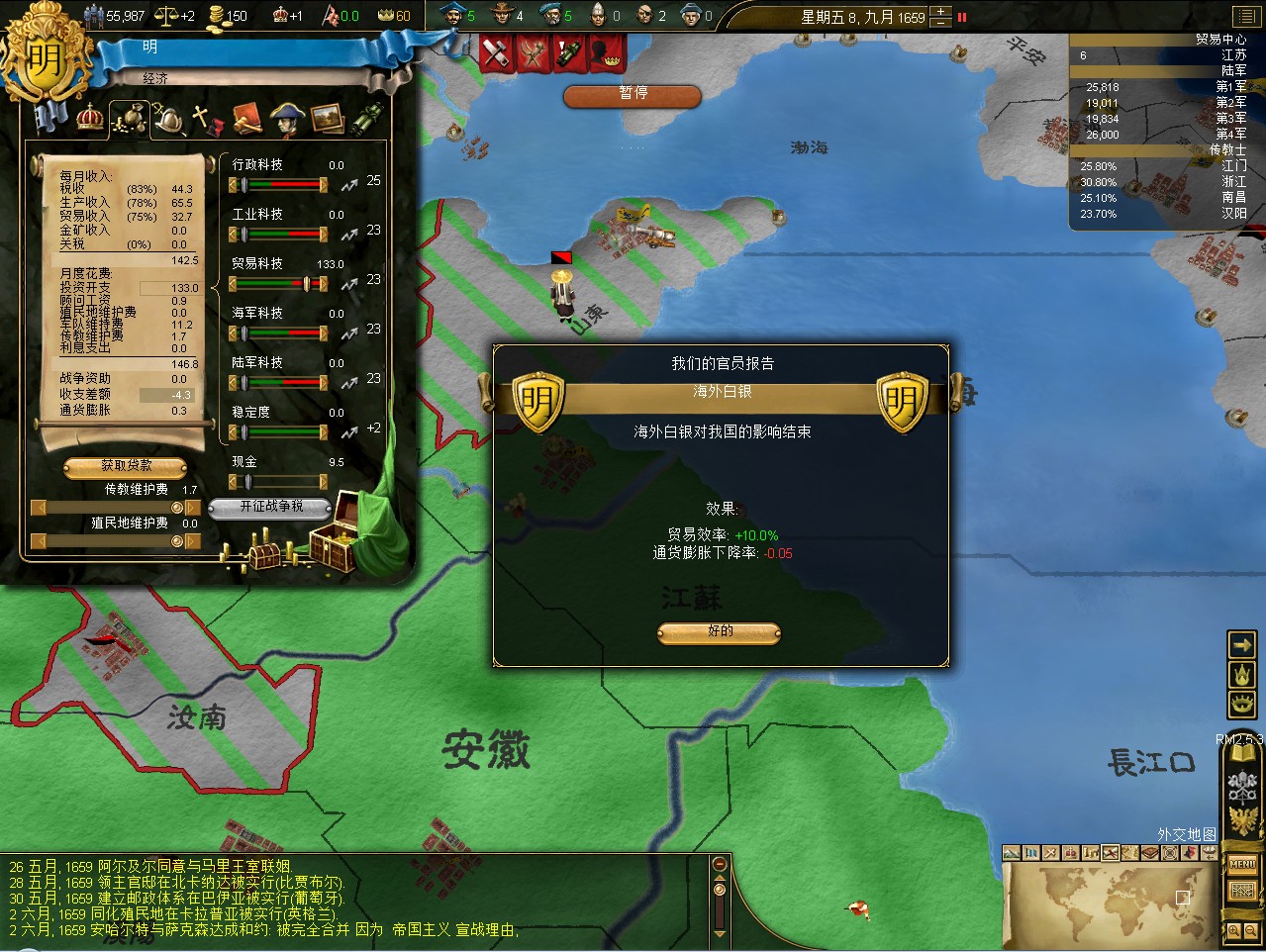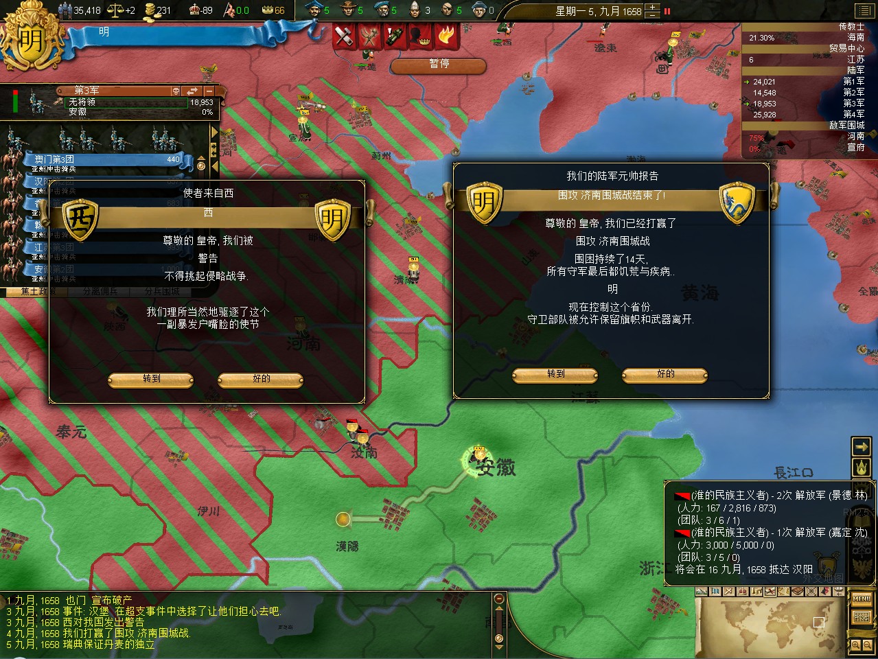 汇报进度。明代中国全境收复,建奴全灭,逆推尼德兰。现有领土:明代中国,满洲,朝鲜(对马(日占),郁陵(朝占)除外),越北,尼德兰旧领2处(包括一个贸易中心),夏威夷,非洲与南太平洋殖民地数块。时间1720年。明日补战报。