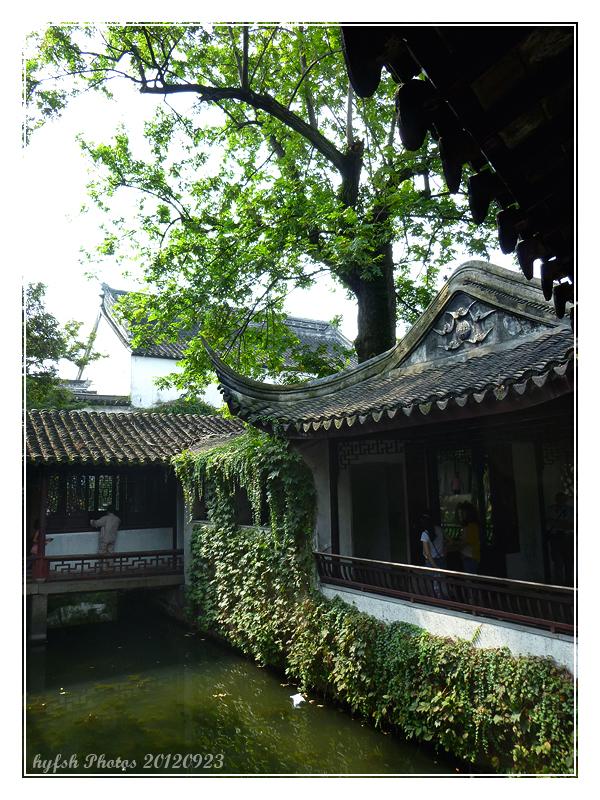 回到“绿荫”,再看曲溪楼,远近花木山水楼阁层次丰富,然仅为肉眼能见,拍成图画即失其趣了。此轩临水而筑,西侧原有一株古枫,小轩笼罩在树荫下,明高启有葵花诗:"艳发朱光里,丛依绿荫边。"故名。轩南庭院与古木交柯相邻,墙上有石匾嵌于其上,钱大昕书"花步小筑"。