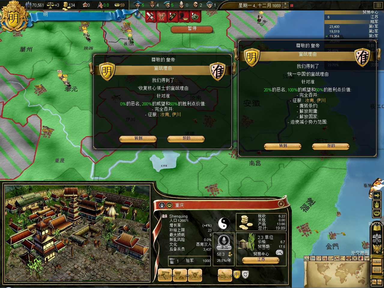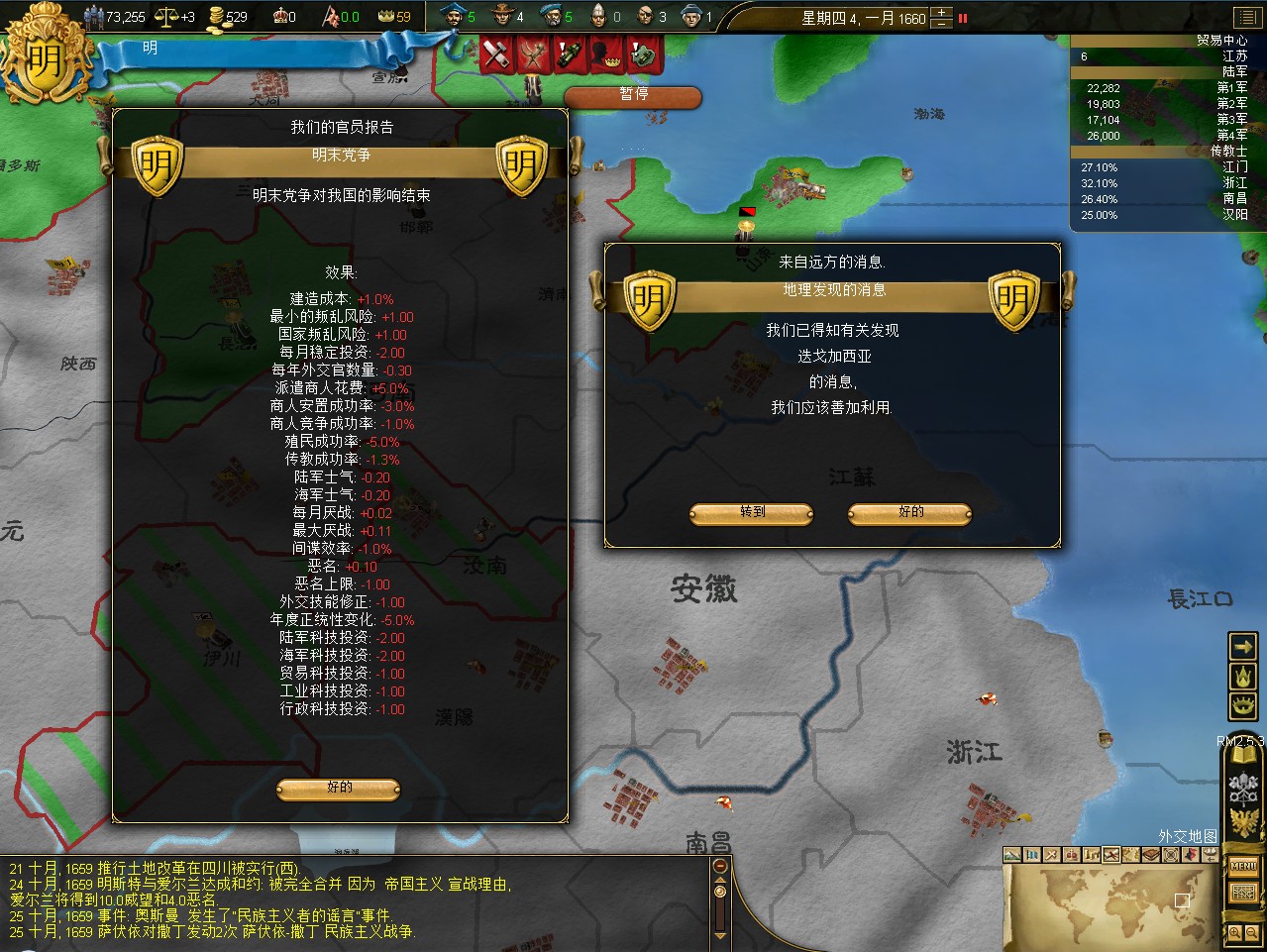 汇报进度。明代中国全境收复,建奴全灭,逆推尼德兰。现有领土:明代中国,满洲,朝鲜(对马(日占),郁陵(朝占)除外),越北,尼德兰旧领2处(包括一个贸易中心),夏威夷,非洲与南太平洋殖民地数块。时间1720年。明日补战报。