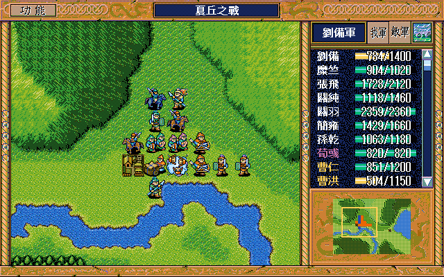 我 刘备右攻步兵1,关羽右3上1激励自己,赵云上攻 关纯右上漩涡灭于禁,藩宫右上攻 张飞右攻灭步兵2,简雍右方假情报弓兵1(失败);