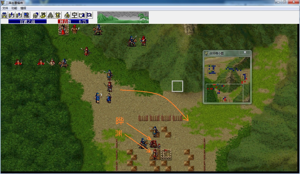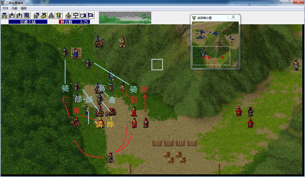 曹操主要砍死弓兵,偶尔也砍步兵,骑兵一般都靠反击杀死,这样比较省回合数。