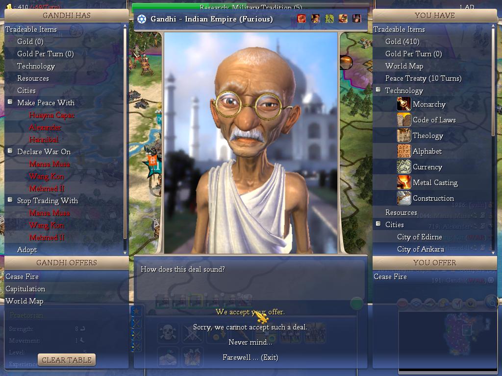 要打架当然要拉上我们的忠实盟友马里了,用非常低廉的代价:造纸+260金换取机械(我先研究过1回合)+对朝鲜开战。