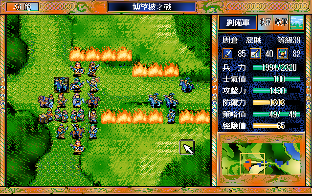 15回合后大家从夏侯惇身上揩油,22回合敌军就位后孔明开始放火,刘封根据情况吃人。赵云先绕到右边,张飞简雍策略补充好后依次过去,赵云再回来继续补策略,这关策略相当充足,3个军乐队,刘备都补了不少。赵何本来还能多反击一次的,但是升级了反倒亏4点,因此没反击。