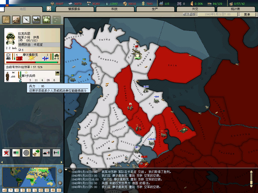 真正麻烦的是空军.我的应对策略是在维堡留2个师挖战壕.其他的部队都3个以上一起行动.飞机就优先炸人少的去了.