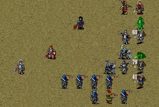 此时骑兵部队出现在左下迎战十铁骑,法师部队出现在右下迎战五法师五道士,步兵部队出现在右上迎战二贼二虎二熊二武术家,弓兵部队出现在左上迎战二炮车二弓骑二弓兵