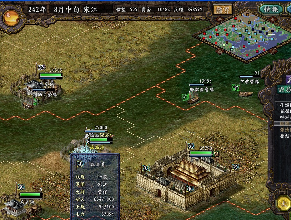 苏杭到手,浔阳港应该要弃了。挡不住,方腊把全国的兵都拿来打这里了。至少也30W吧。砸墙都把我给砸死。没发动战法一旬也要掉7,8千兵。没有招降到李俊他们,就一个费保水军熟练,不敢出兵。应该挡不住,撤了,反正一共才净损失了2W兵左右。