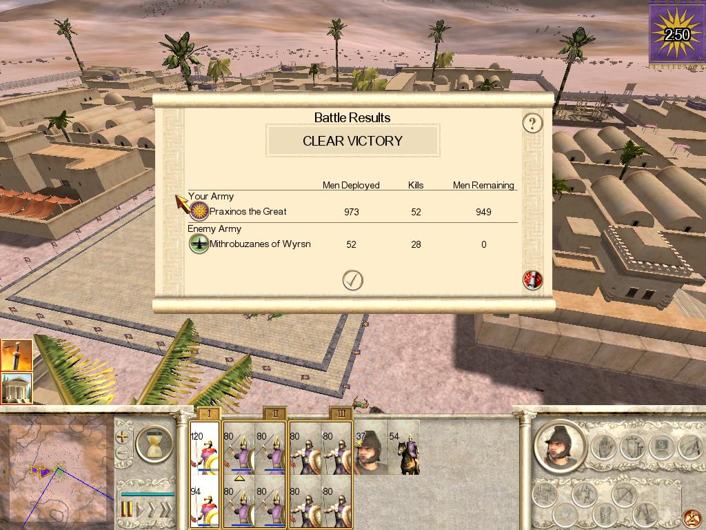 普拉克西诺斯凭借压倒性的兵力优势,向只有波斯将军威尔森的米斯拉达卡守卫的拉科蒂斯发动强攻,由于普拉克西诺斯的2队近卫步兵和4队阿格瑞安标枪兵对波斯将军卫队的战车有额外的攻击加成,因此他的大军在击毙威尔森的米斯拉达卡后,迅速夺取了城市