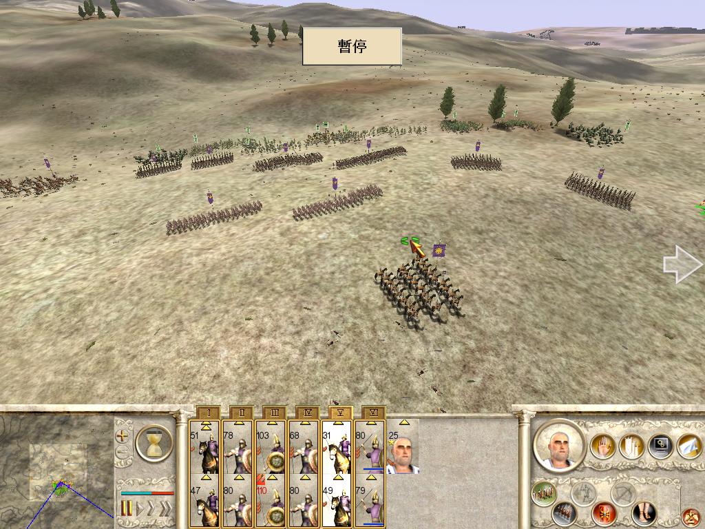 敌军由于缺乏足够的骑兵,仅仅在右翼布置了1队赫卡尼亚重骑兵,中央战线是3队波斯步兵和1队卡尔达克重步兵,敌军的二线部队是2队波斯游击步兵和1队赫卡尼亚重骑兵