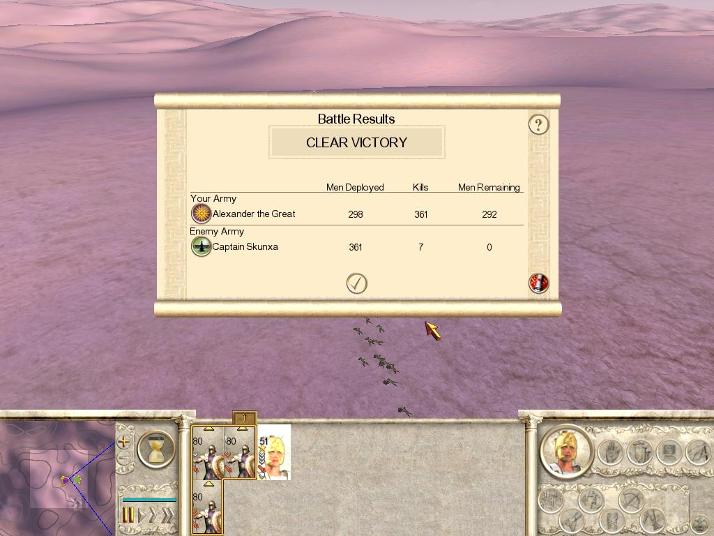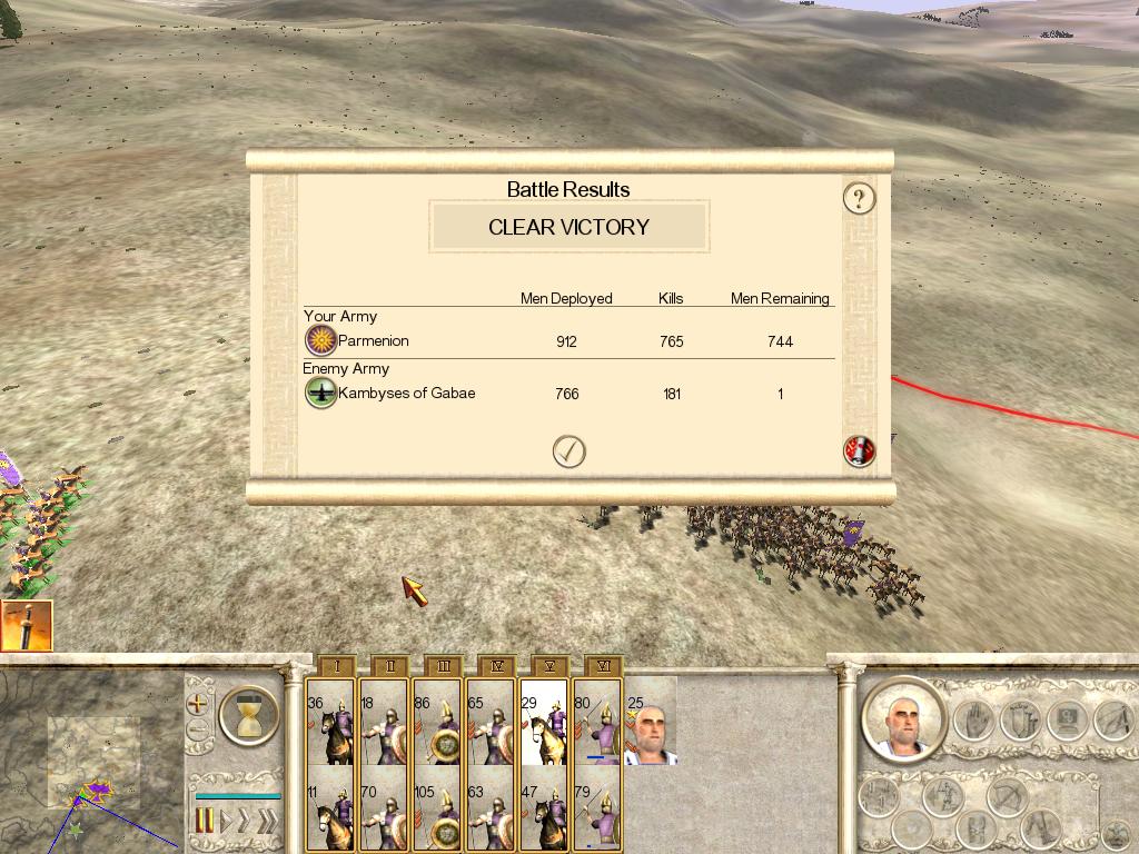 由于亚历山大本队有3对身经百战的重装步兵和经验达到6级的亚历山大卫队,而波斯人只有3队波斯步兵,因此我军以极轻微的代价全歼了这支敌军