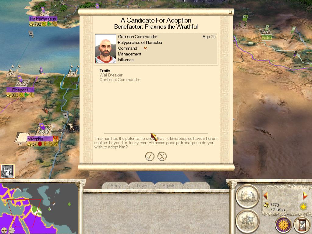 普拉克西诺斯对埃及烈火疾风般的征服,使他本人被人敬畏的称呼为「愤怒的普拉克西诺斯(Praxinos the Wrathful)」,同时他在埃及当地收养了第一个养子赫拉克里亚的波利波卡斯,具备「破墙者(攻城时统帅加2)」和「自信的指挥官(统帅加1)」的属性