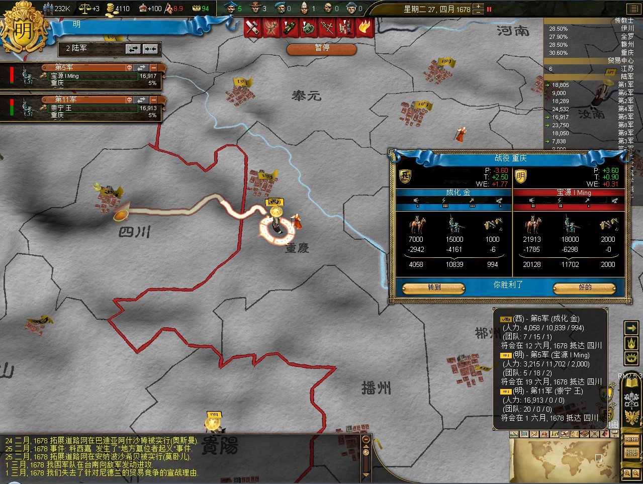 我军在重庆投入大量兵力,吾皇御驾亲征,击溃了对方大将金成化。
