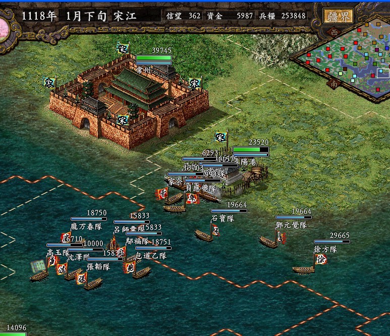 苏杭到手,浔阳港应该要弃了。挡不住,方腊把全国的兵都拿来打这里了。至少也30W吧。砸墙都把我给砸死。没发动战法一旬也要掉7,8千兵。没有招降到李俊他们,就一个费保水军熟练,不敢出兵。应该挡不住,撤了,反正一共才净损失了2W兵左右。