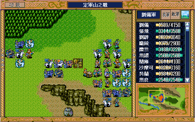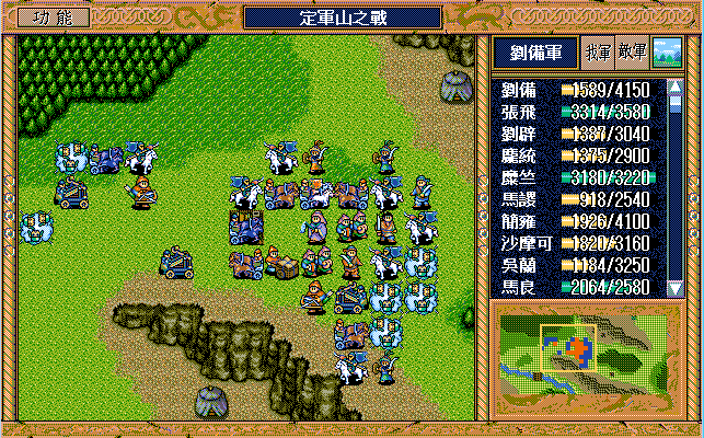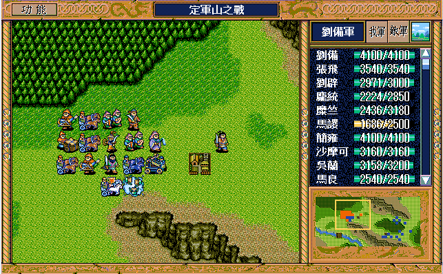 敌 弓兵1原地浊流(失败),夏侯渊右下激励异民族2(升级),夏侯尚右右下下攻击庞统,步兵1原地援助弓兵1(少,同样是为了防止他攻击马谡),步兵2原地攻击沙摩可(奇怪不用火龙,应该跟刘备有关),骑兵2右攻击魏延,骑兵4下攻击吴兰,异民族1右上攻击魏延,异民族3右下攻击吴兰,骑兵5上攻击魏延,骑兵6右攻击张飞,骑兵9左攻击刘备,弓兵2左方两格浊流简雍(失败,三回合)。