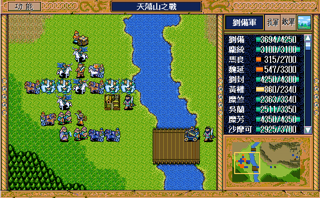 我 魏延左、王平下攻击消灭弓兵6,庞统右下牵制运输队2,糜竺下激励、吴兰左援助(少)、刘封左下援助庞统,黄权左激励、糜芳左下援助、马良下援助王平,刘辟右上援助魏延,沙摩可右二上三休息,张飞右二上一激励自己,刘备上三左二;